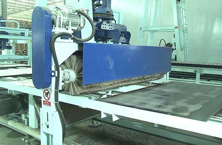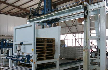 1) يقوم الناقل بإنزال المنتجات إلى ناقل الطوب ومن ثم يتم نقل الطوب المعالج إلى منطقة النقل بالطبليات. حينها يتم تكديس المنتجات ونقلها بالرافعة الشوكية إلى ساحة تكديس المنتجات الجاهزة. يتم بعد ذلك تنظيف الطبليات بواسطة مكنسة وترجع ماكينة تدوير الطبلية إلى مكان تكديس البالتات.